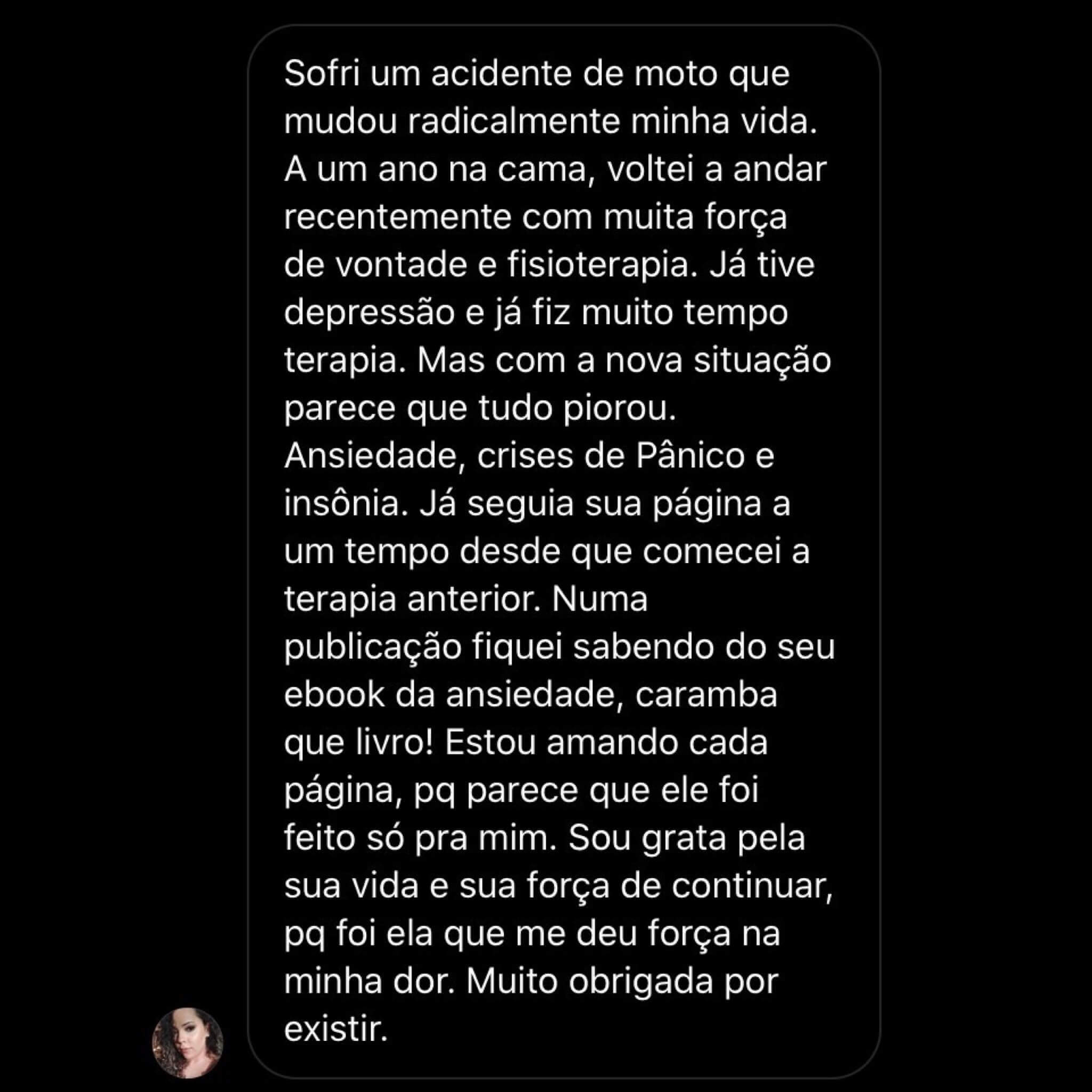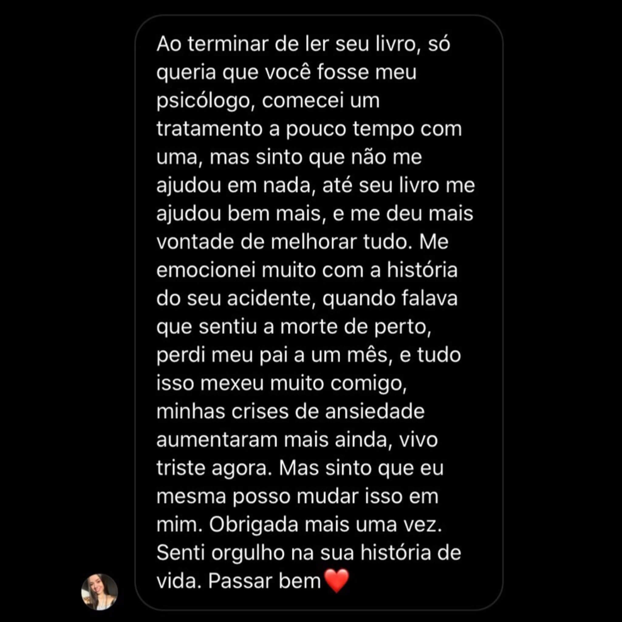 Após um grave acidente aos 12 anos destruir minha saúde fisica e mental, enfrentei cara a cara crises ansiedade e a depressão profunda. Depois de anos, consegui vencer a batalha, me especializei em Hipnose Clínica e hoje escrevo a obra “Em um relacionamento abusivo com a ansiedade” para mostrar tudo que fiz para eliminar as sensações de que algo ruim iria acontecer, o medo que paralisa, a fadiga, vazio interno, falta de ar, tontura, preocupação excessiva, constante vivência do passado, falta de concentração e insônia.